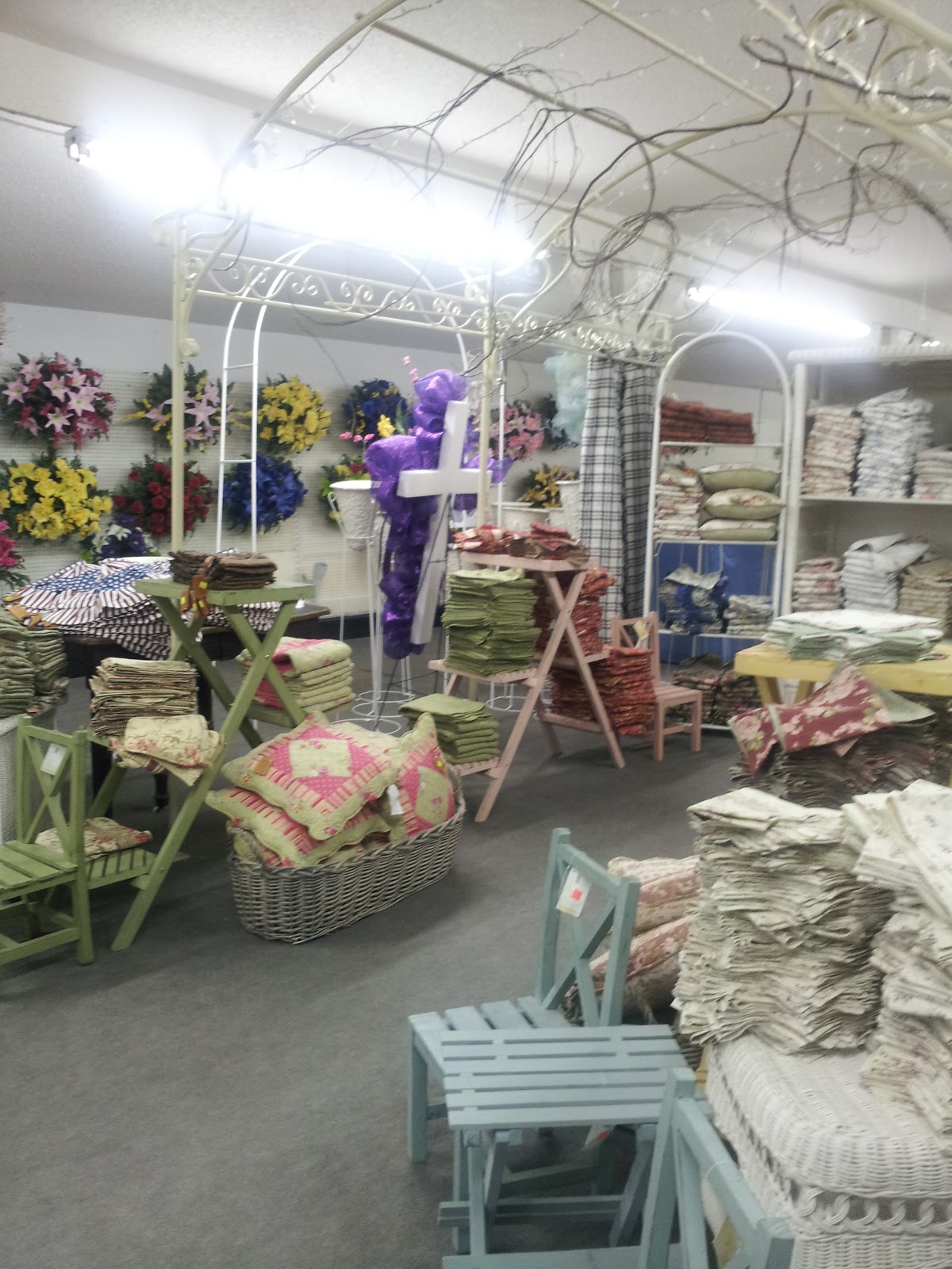 Several ladies that have volunteered to help agreed to go with me to a place one of them had told us about in Fancy Gap, Virginia (don’t you love that name? I do). The store was called, Fancy Gap Pottery and Fabric Outlet, a couple hours from here. You can buy flowers and all kinds of crafty and decorating things for a much reduced price. I had never been, but had heard it was wonderful. So yesterday, we piled into my car and made a day of shopping and purchasing things for the retreat. Yes, it was rough, but we sacrificed for the sake of ministry and went. (Just kidding, of course! We had a ball!) The savings were incredible! Take a look at one small section of the store…