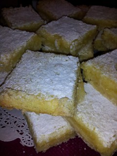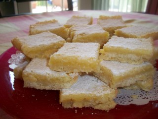 Bake at 350 degrees or ’til brown and set. Cool. Sprinkle with 1/4 C powdered sugar and cut into bars.