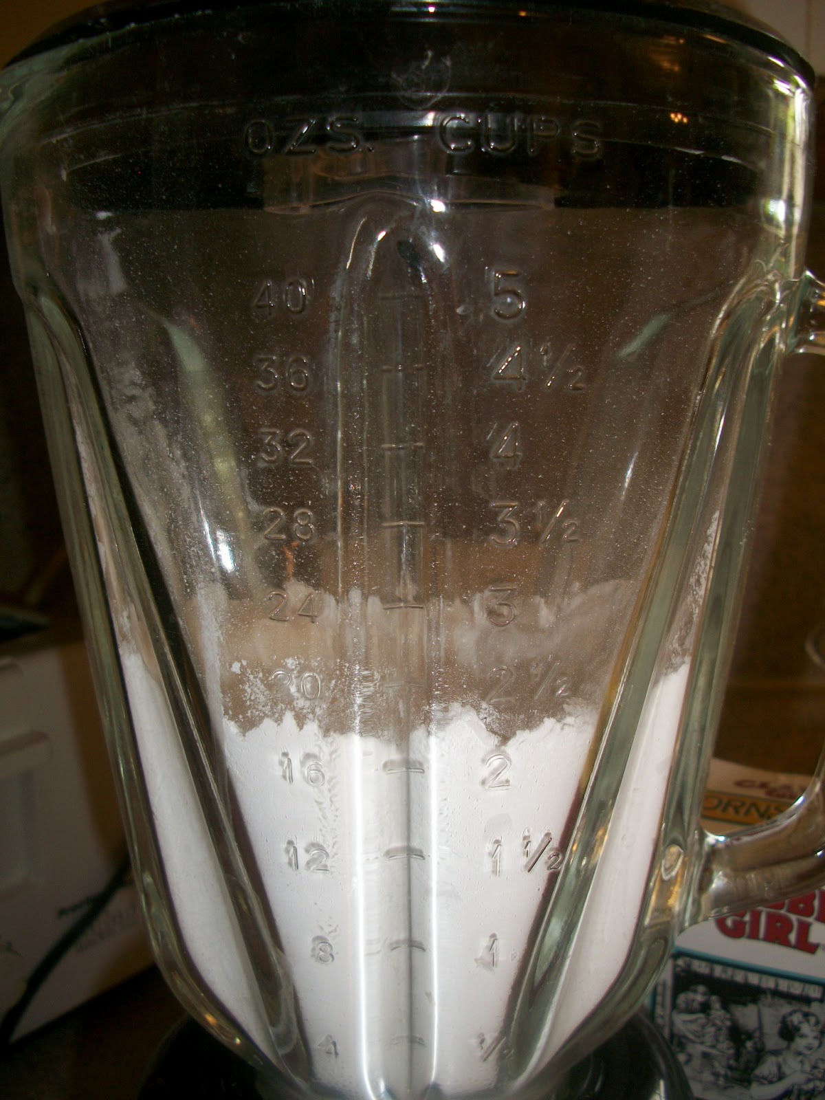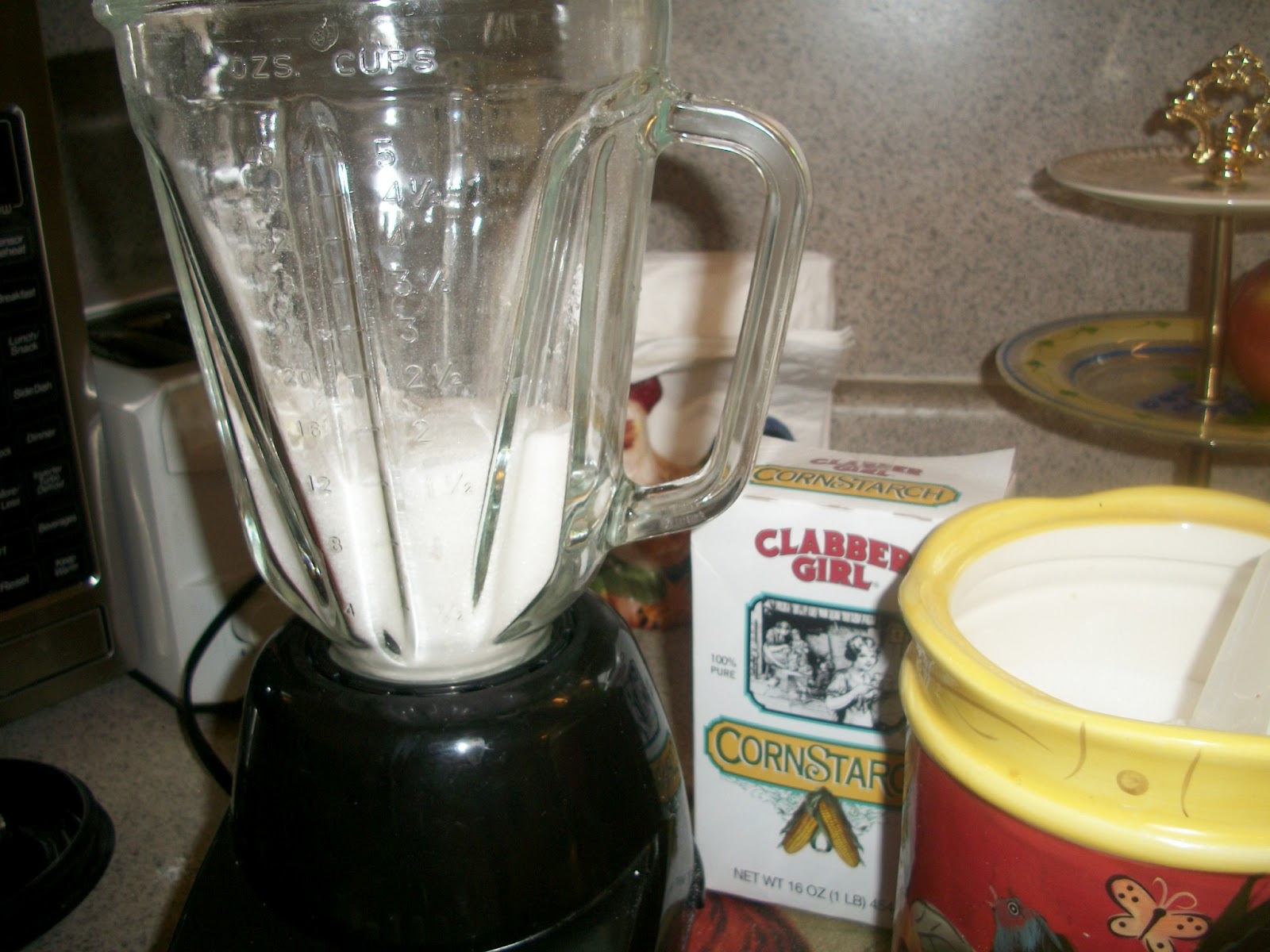 For each cup of powdered sugar you need, use that much granulated sugar. Place in blender. Add 1-2 Tablespoons of Corn starch to each cup of sugar to prevent clumping and improve thickening ability.