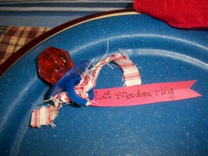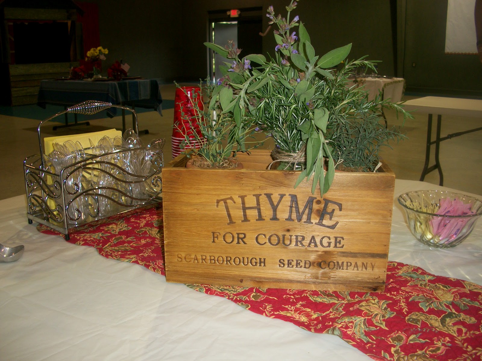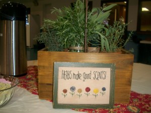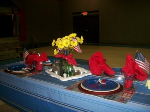 Ethel Johnson did a country farm kind of table complete with sheep, bandannas, and red and white geraniums. The red barn behind her table was painted that day for our summer children’s ministry. Pretty nice that it happened to go along with her theme!
