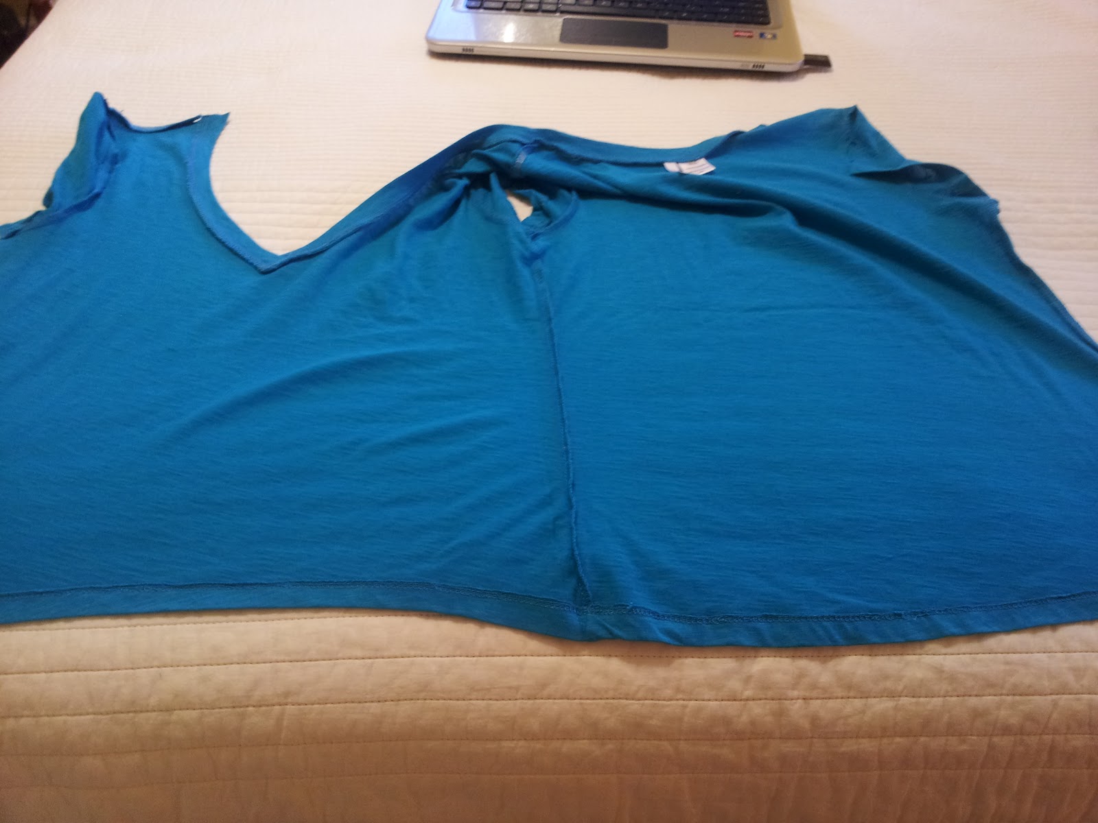 The larger size was to be used to cut up for my ruffles. The side of the shirt was cut open to allow for strips to be cut.