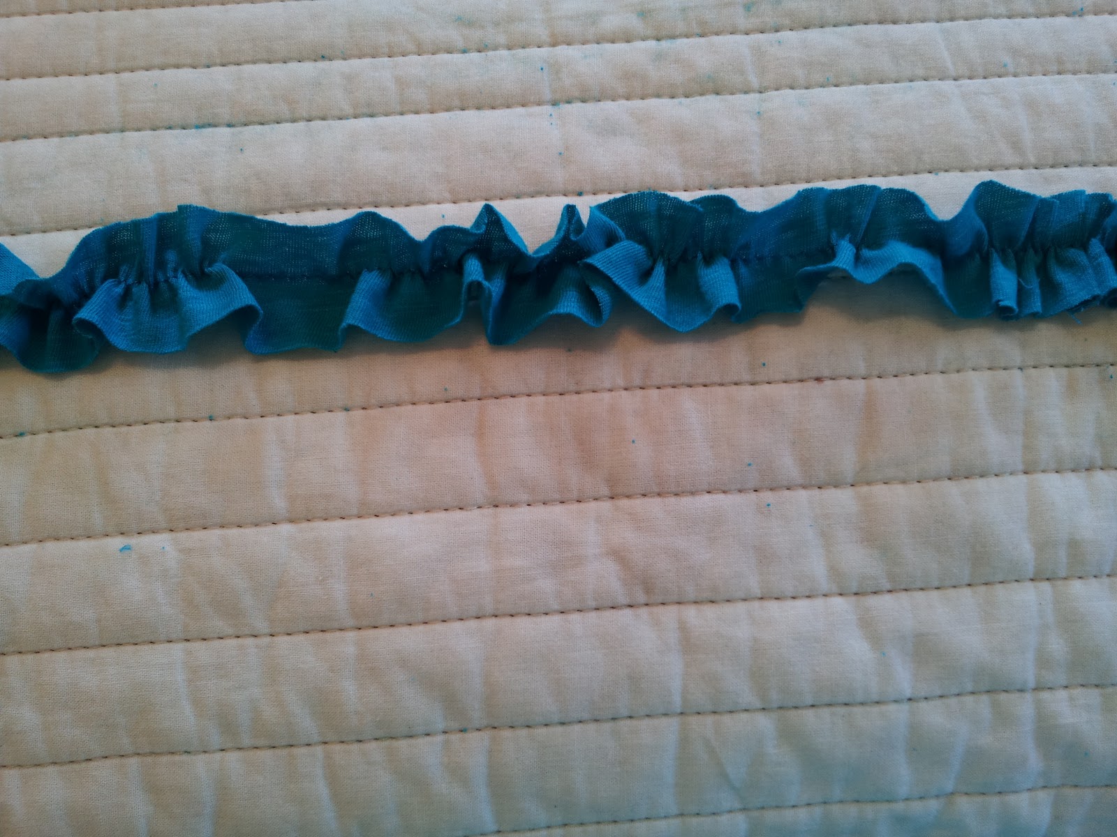 Six 2 1/2 inch strips were cut first, 12 inches in length. I made basting stitches 1/4″ from the edge of each strip, then gathered the strip until it was 7″ in length.