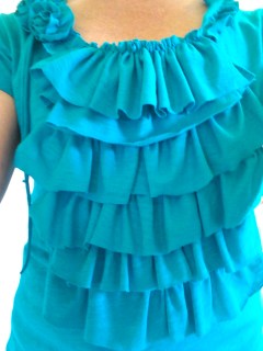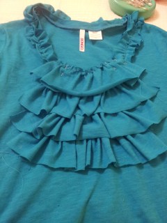 I placed the narrow strips around the neck of the shirt, leaving the middle of the shirt neck open for the wider ruffles.