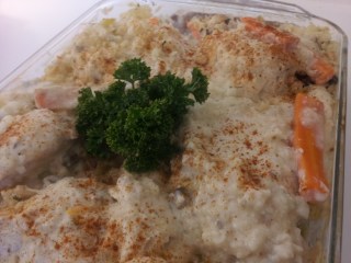 This is one of those comfort food kind of casseroles with chicken, rice, carrots and cream of mushroom soup.  The gravy base  has sour cream and milk added to it.  The rice and “gravy” part really flavors the chicken nicely.