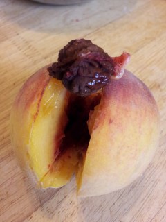 2. Wash peaches; dry carefully. With small knife, cut unpeeled peach vertically down one side. Pull out seed, keeping peach halves attached on other side, if possible. Repeat with all peaches. Peel peaches, if desired.