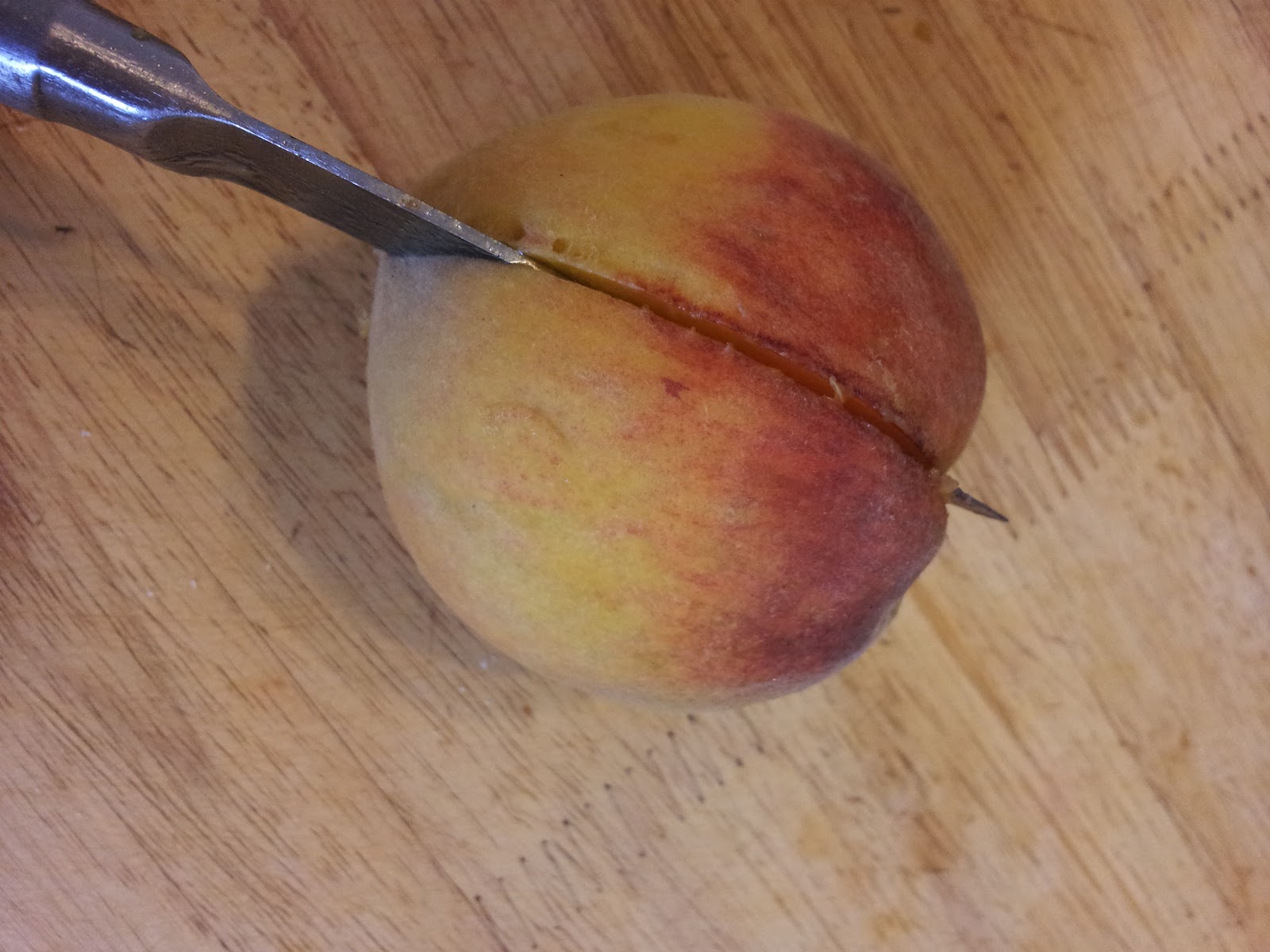 2. Wash peaches; dry carefully. With small knife, cut unpeeled peach vertically down one side. Pull out seed, keeping peach halves attached on other side, if possible. Repeat with all peaches. Peel peaches, if desired.