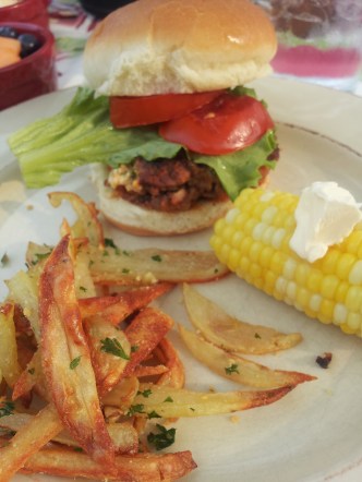To accompany the burger, Alli made Garlic Fries from Cooking Light. Hello deliciousness! These are amazing. Because they’re baked, not fried, they are much healthier…if you can keep from eating the whole pan (good luck!).