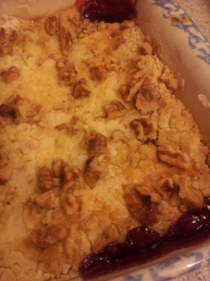 1 can (20 oz.) cherry pie filling 1 pkg. yellow cake mix 1/2 to 2/3 c. chopped nuts 1/2 c. butter Grease a 9 x 13 inch pan. Dump in the pineapple and juice, spreading evenly. Pour cherry pie filling over the pineapple, spreading evenly. Add dry cake mix evenly over the fruit. Add nuts, then slice butter and lay all over the top. Do not mix. Bake in a 350 degree oven 1 hour.