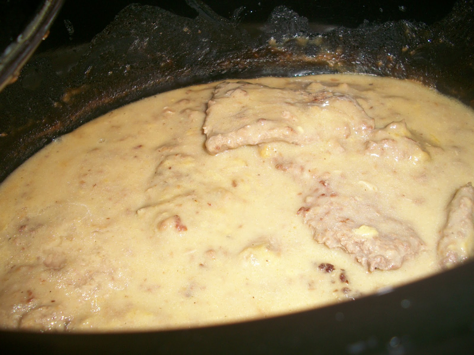 Dredge steak in flour seasoned with salt and pepper. In a skillet, brown meat on both sides in a couple tablespoons of hot oil. Place in crock pot.