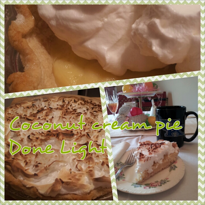 Can you believe that a “normal” piece of Coconut Cream pie has 423 calories and 23 grams of fat? This one from Cooking Light has 281 calories and 9 grams of fat…and you would never know it! I’ve changed over, friends. This is my new “go-to” recipe! It’s yummy!!!!!!