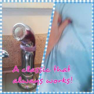 | This little rubberband around the spray nozzle was the cause of the wet shirt on my husband. =) |