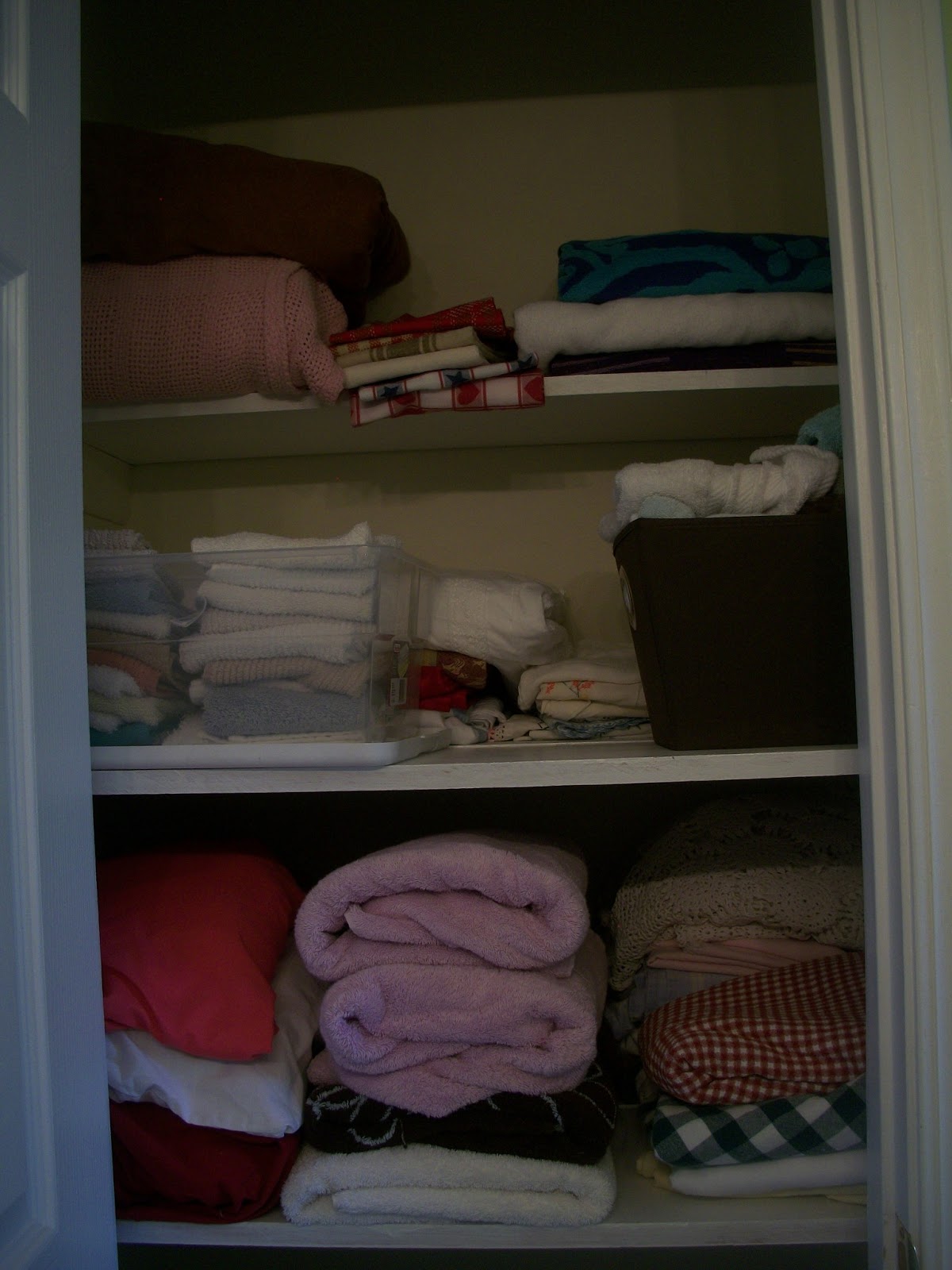 I got rid of LOTS of old towels and other linens that had seen better days.  Then I organized things into places and spaces that makes it much easier for me to get to them.  I dust mopped the closet floor as well.  Here’s the full shot…