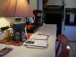 | This is my “command” center. Planner book, mail, etc. It needed attention. Also needed to creatively hide the lamp cord. |
