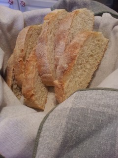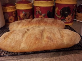 We had lunch at church yesterday, so I decided to take a couple tried and true recipes, and one new salad. I made a cold Italian macaroni salad since it was going to be a hot day. I then decided on homemade French Bread (that I’ve shared before) to go with it. This bread is so easy and is a perfect accompaniment to a salad. It can be on your cooling rack in a matter of less than two hours and it makes two loaves!