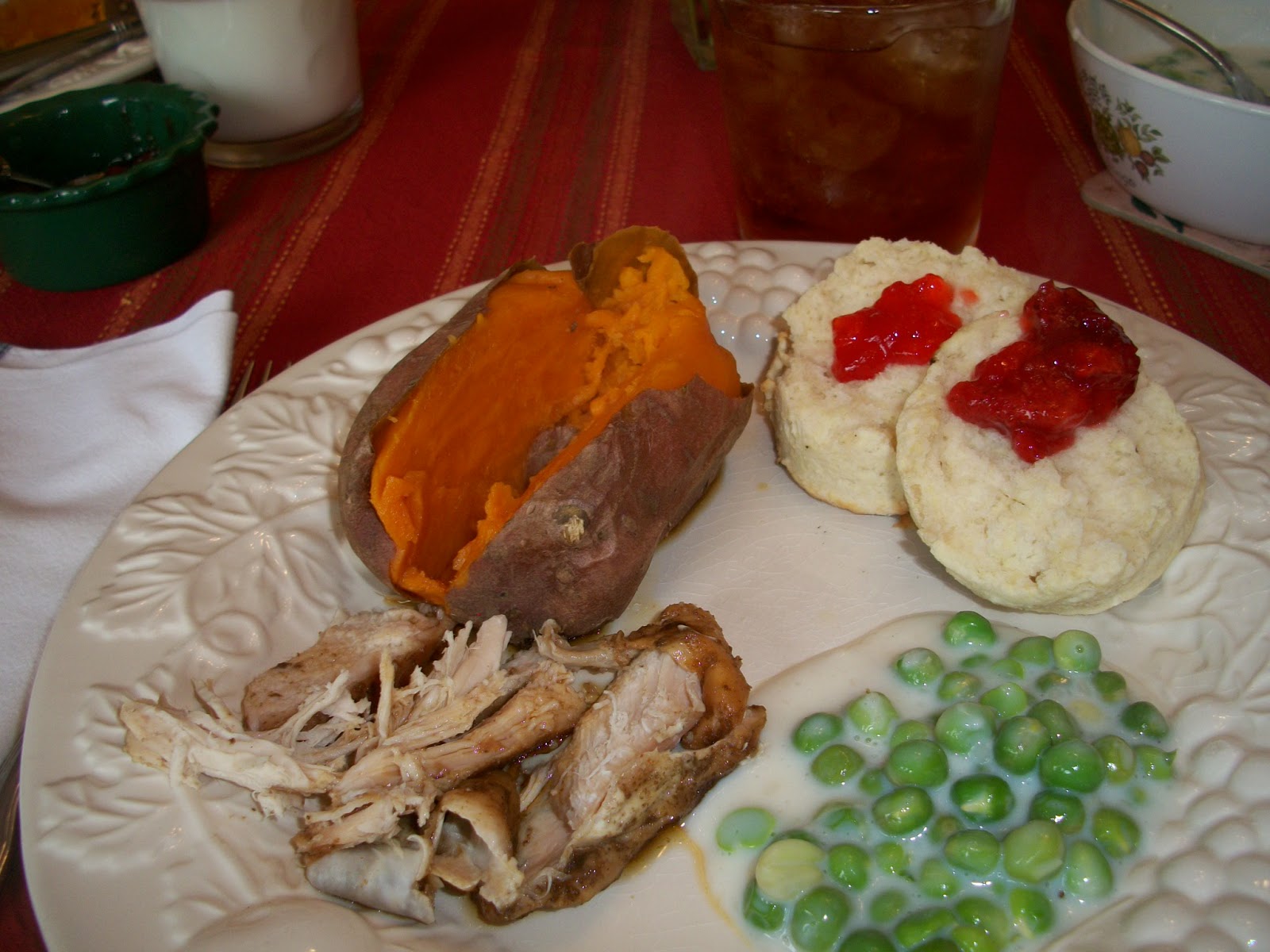I put sweet potatoes on the timer in the oven, then also made creamed peas with some fresh garden peas a friend shared with us from their lovely produce.