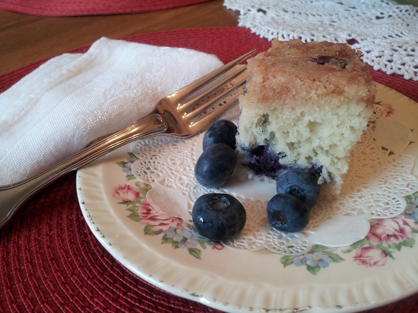 This yummy blueberry coffee cake was made by a great cook in our church, Jane. She brought it to our Sunday morning fellowship last week and I was fortunate enough to get the last crumbs on the plate! It’s really moist and has a nice crunchy sugar topping. This would be a great Saturday/Sunday breakfast! Jane was sweet enough to share her recipe with me:
