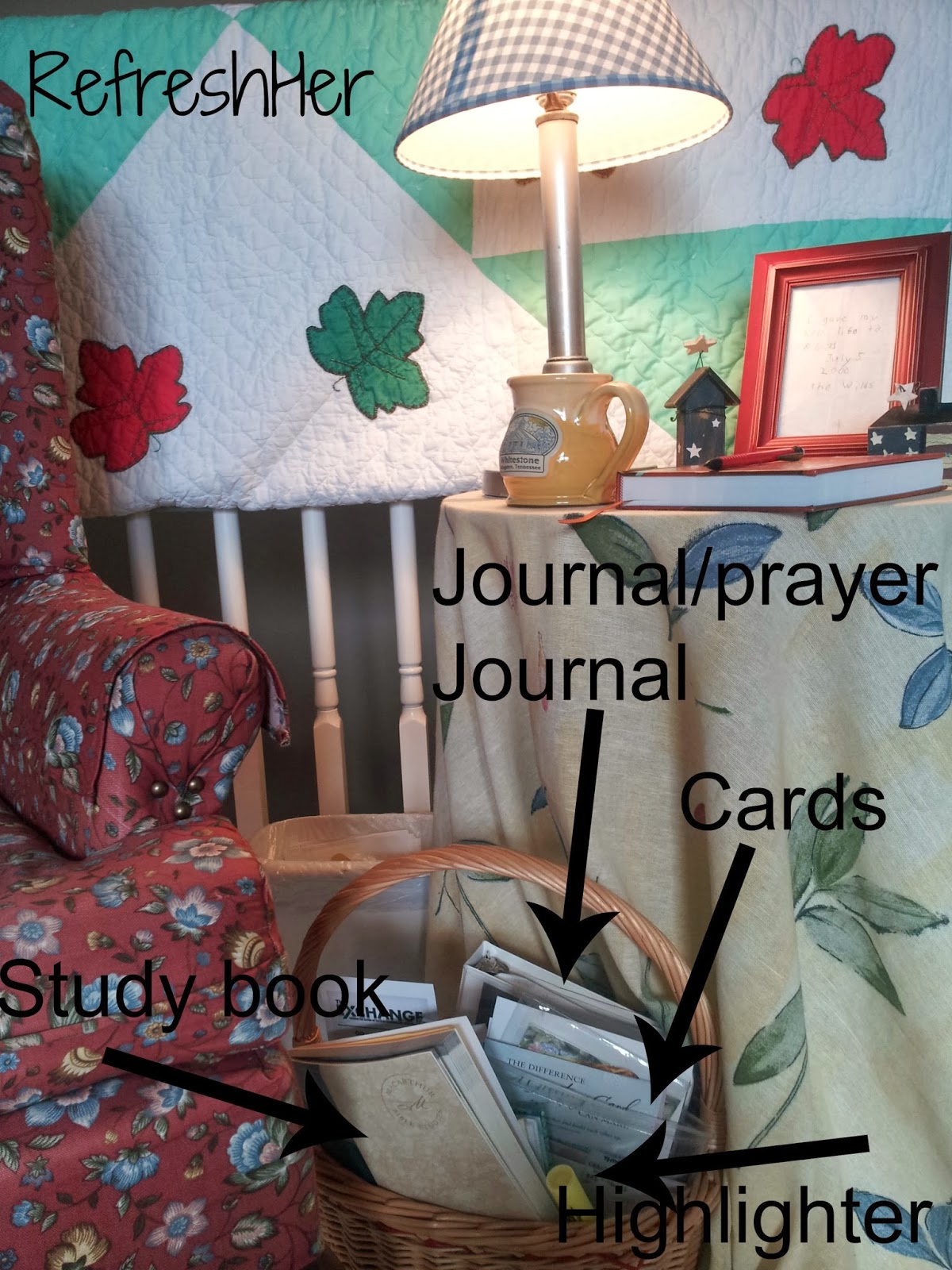 Today I’m going to take you off the porch and we’re going to go inside and then upstairs to a place that is very special to me. There’s nothing sacred about this place; there’s no burning bush, but it is dear to me, because it is where I’ve chosen to meet with the Lord each day.