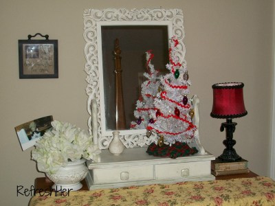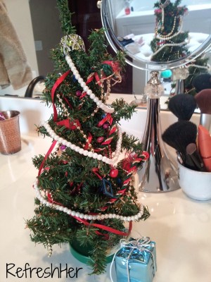 My little tree on the vanity decorated with ornaments and jewelry. =)