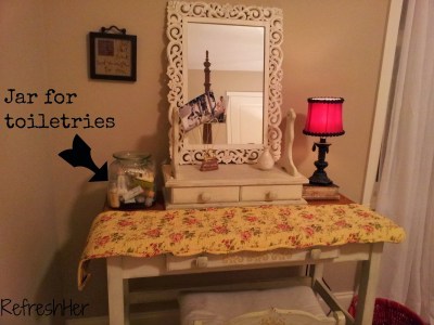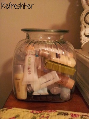 Freshen up your guest room – even if it’s a room that is normally occupied by a family member, by filling a jar with items they can use while they’re in your home. You’ll be refreshing them them at the same time!