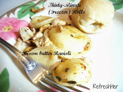 To go with the ravioli, I made dinner rolls. It’s pretty impossible to have homemade rolls fresh out of the oven on a Sunday, but this do-ahead recipe was great! I made the dough, froze it, then took it out of the freezer for two hours before church. I then covered the pan and put them in the fridge. When I got home they had risen to the perfect size to pop into the oven! They taste like Sister Shubert Rolls! What a great recipe! It’s from Money Saving Mom site. I’m so glad a friend at church put me onto this recipe. Thanks, Laura! They will be a mainstay in my freezer!