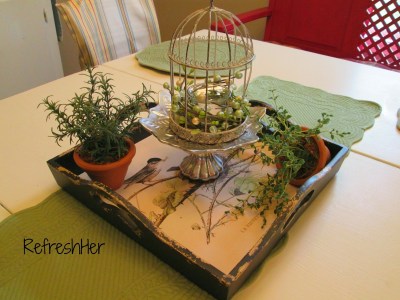 This adorable tray was in another room, but for now it’s on my dining room table, along with my sweet little birdcage and my potted herbs. |