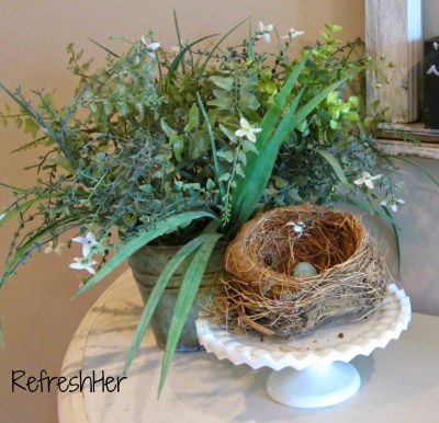 | I borrowed this greenery from another room and added the bird’s nest that had been abandoned a few years ago. |