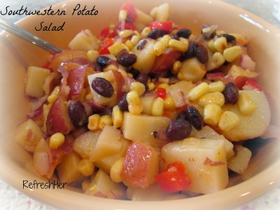 I found a potato salad recipe in my Cooking Light Cookbook that would be perfect to take on a picnic because it has no mayo in it. The flavors and the ingredients are very similar to the turkey burger recipe I shared above, making it a great accompaniment to this meal!