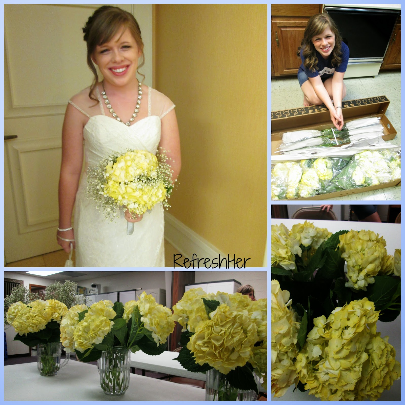 The flowers for the wedding were really important to Alli. She has always dreamed of having hydrangeas, and so she looked into finding some at a great price. Sam’s Club was very reasonable and they shipped them right to our door on the day she requested! They arrived on Thursday so a dear lady at church could make up the arrangements and bouquets. The bride’s bouquet was hydrangeas and baby’s breath. The bridesmaids carried only baby’s breath. The reception tables had arrangements with the lovely yellow blooms. It was very simple and elegant!