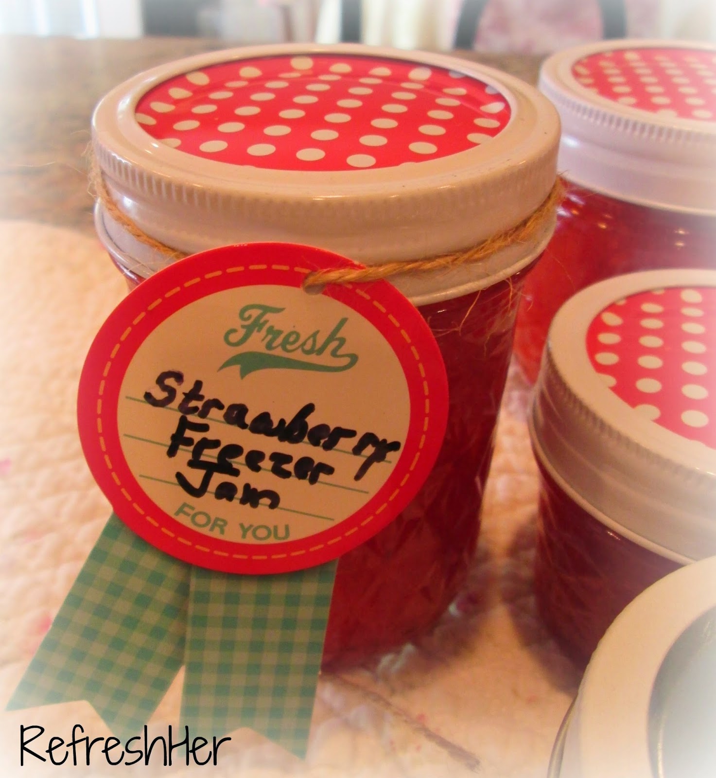 Yesterday was “Freezer Jam-making day!”Nothing freshens up a day like a row of jars of Strawberry Freezer Jam on the counter! I always make at least two batches and maybe three, because we love this stuff! We put it on toasted Sour Dough bread, English Muffins, or Strawberry muffins. Our goal is to have a jar for Christmas day Angel biscuits, so I have to make sure that the quantity in the freezer will last until then!