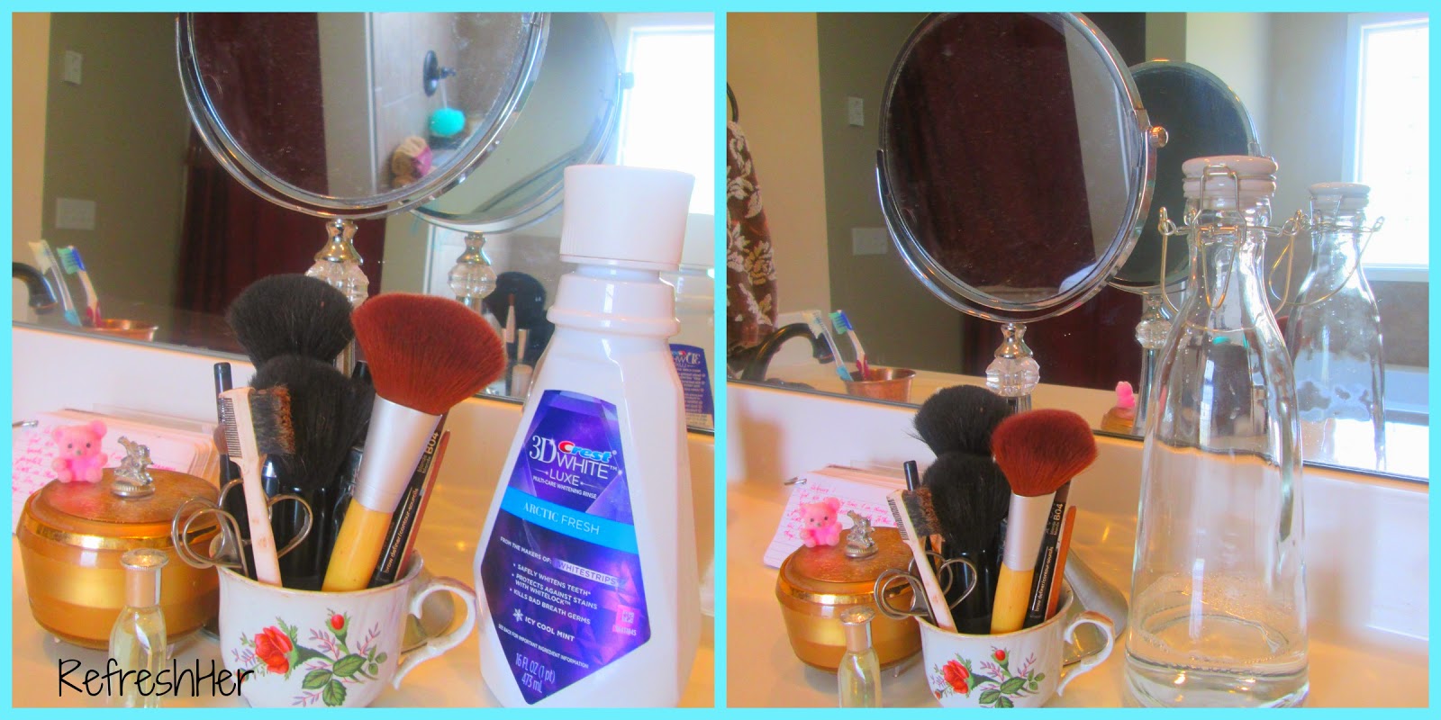 I know this isn’t genius, but like I said, sometimes it’s just the little things that make you smile. If your bathroom counter is cluttered up, why not look for pretty ways to display the necessary creams and liquids. You might want to label the bottles if you have more than one. You don’t want to rinse your mouth with rubbing alcohol. =) That could turn a smiling day into a puckering one!