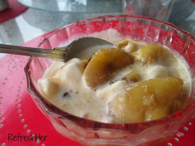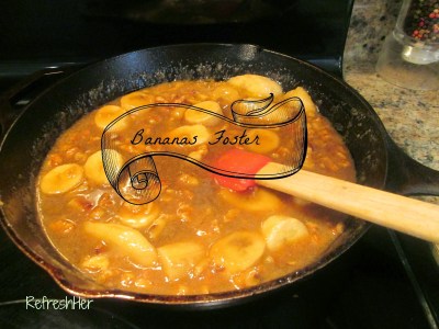 Now for dessert! If you’ve never had Bananas Foster over cream, let me explain. It’s a wonderful caramel sauce with nuts and bananas swimming in it, then spooned over ice cream. It’s typically set ablaze with rum and a torch. We don’t drink. I don’t keep rum for cooking, sooooo, I just used some flavoring. =) It was divine! This is a super fast dessert to make. Again, perfect for Sunday!