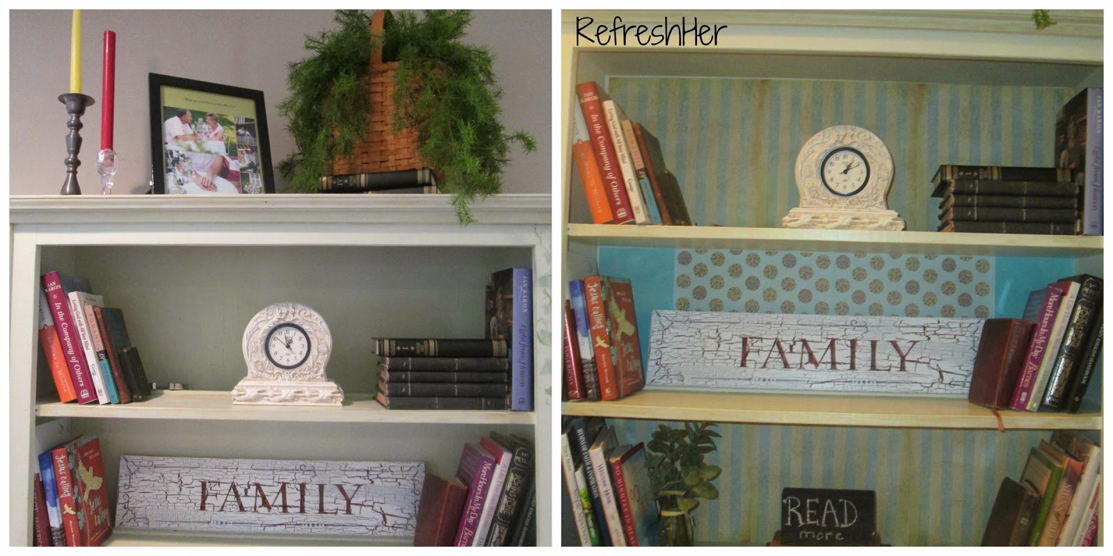 Then another little change I made was to add some texture and print to my bookcase. I did that simply by placing sheets of scrapbooking paper at the back of the cabinet. I was surprised how much it added!