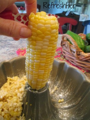 Set the corn cob on the middle part of a bundt or tube pan, then cut the kernels off. They will fall (for the most part) into the bundt pan and not all over the counter! It’s a genius idea!