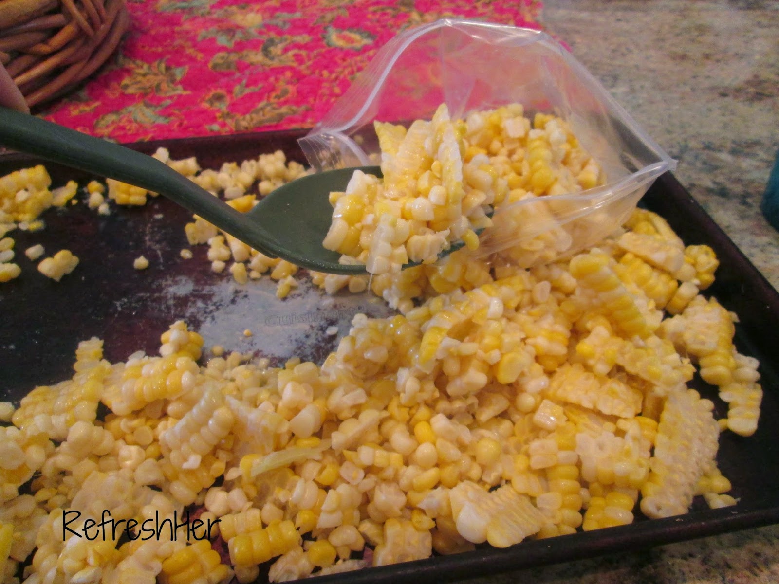 Then spread the corn onto a baking sheet and freeze for about 15 minutes. The kernels will then be ready to pop into a freezer bag until you’re ready to use it!