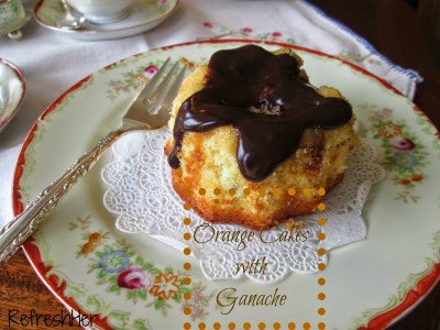 For a lunch with friends last week, I was asked to bring dessert ~ something chocolate. Yay! A chance to bake something new! I had seen Ina Garten make some little individual cakes on her show recently, and my mind went to those little gems ~ Orange Cakes covered with Chocolate Ganache. Yes, please!