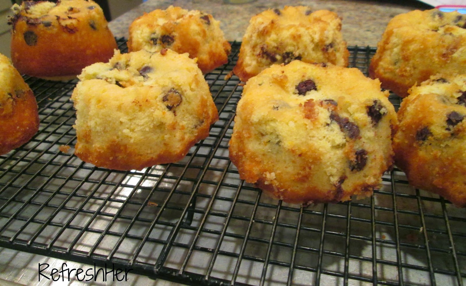 Sift together 1 1/2 cups flour, the baking powder, baking soda, and salt in a large bowl. In another bowl, combine the orange juice, buttermilk, and vanilla. Add the flour and buttermilk mixtures alternately in thirds to the creamed butter, beginning and ending with the flour. Toss the chocolate chunks with 1 tablespoon flour and add to the batter. Pour into the pans, smooth the tops, and bake for 30 minutes, until a cake tester comes out clean. Let the cakes cool in the molds on a wire rack for 10 minutes.