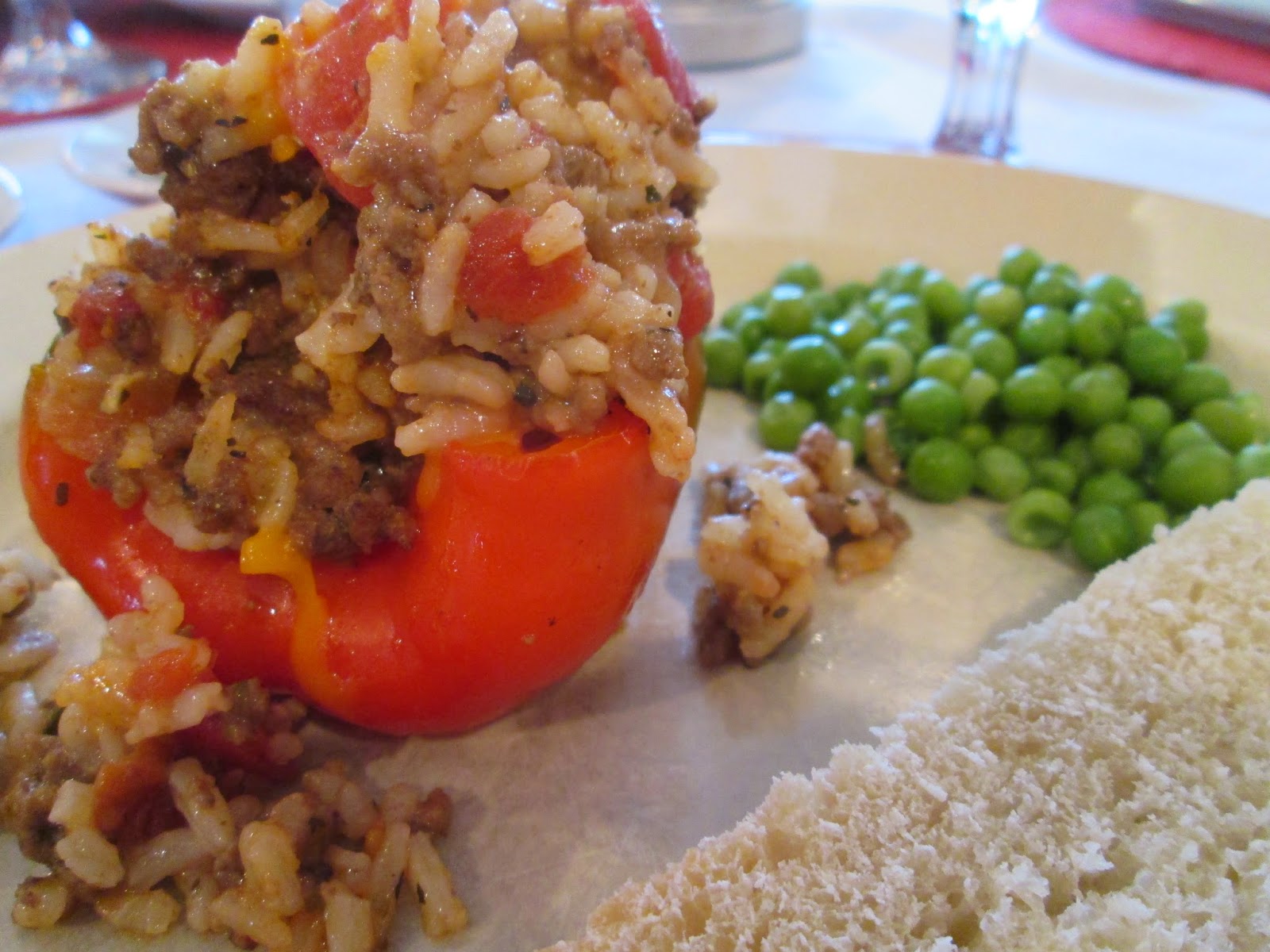 In a large skillet cook meat and onion till meat is brown and onion is tender. Drain fat. Stir in tomatoes, cooked rice, water, Worcestershire sauce, basil and pepper. Bring to boiling; reduce heat. Cover and simmer for 5-10 minutes. Stir in half the cheese. Spoon meat mixture into peppers. Place peppers in 8x8x2 in baking dish. Spoon any remaining meat into baking dish.