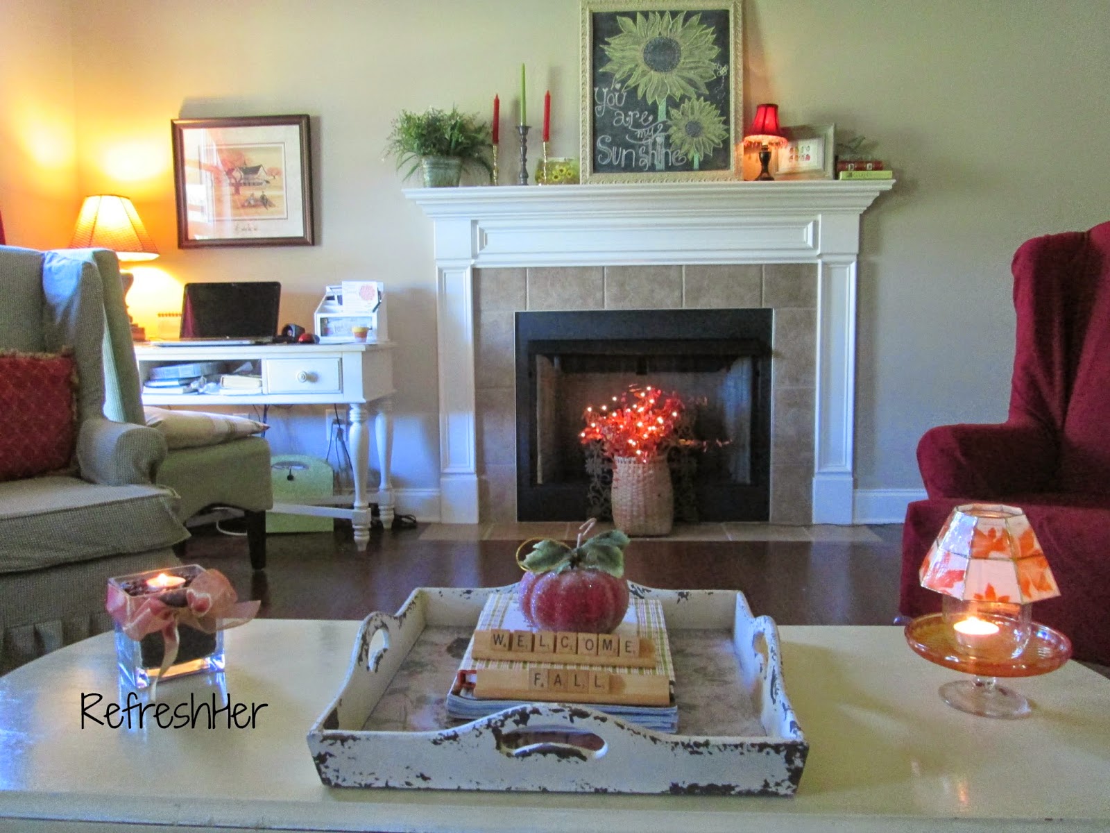 Last week I drug out the bins of my fall decor to give the inside of my house a touch of fall here and there.  I decided not to do my mantles yet, but just add some subtle touches in a few spots.  If you peeked in from the porch this is what you’d see: