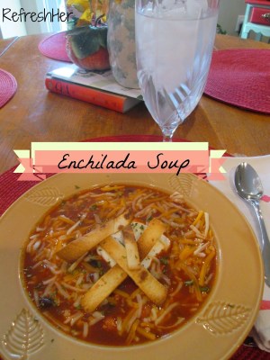 We love Mexican food. We love soup. Put the two together, and you have a fabulous combo ~ it’s called Enchilada Soup! I found this recipe on Pinterest and tucked it away for a fall day. That “day” came last week. This is one of those “dump” soups. You pretty much open up cans and dump them into the pot. I even used Rotisserie chicken that I’d frozen, so I didn’t even need to roast the meat for it!