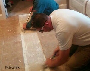 During the first year of living in our new home, we were to take note of any fixes the contractors needed to take care of. After several months, we noticed a loose piece of wood floor in the kitchen. Then upstairs in the main bathroom, something caused a fine line crack to appear. Perhaps a settling of the house? At any rate, both needs were duly reported. Yesterday was the day for the repairs.