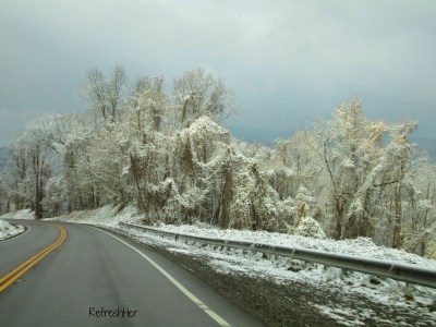 | We got a lovely snowfall early in the morning. This was our view as we traveled. The roads were clear and the sights heavenly! |