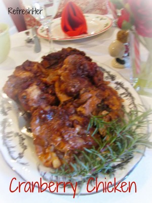 Happy Monday after Christmas! Are you as ready as I am to eat “normal” again? Well, if you happen to have an extra can of Cranberry sauce leftover from your festivities, you must pour it over chicken or pork and make this dish! I did it in the crock pot for Sunday dinner and it was great! Not too caloric or fattening, but plenty heavy on flavor ~ you’ll love it!