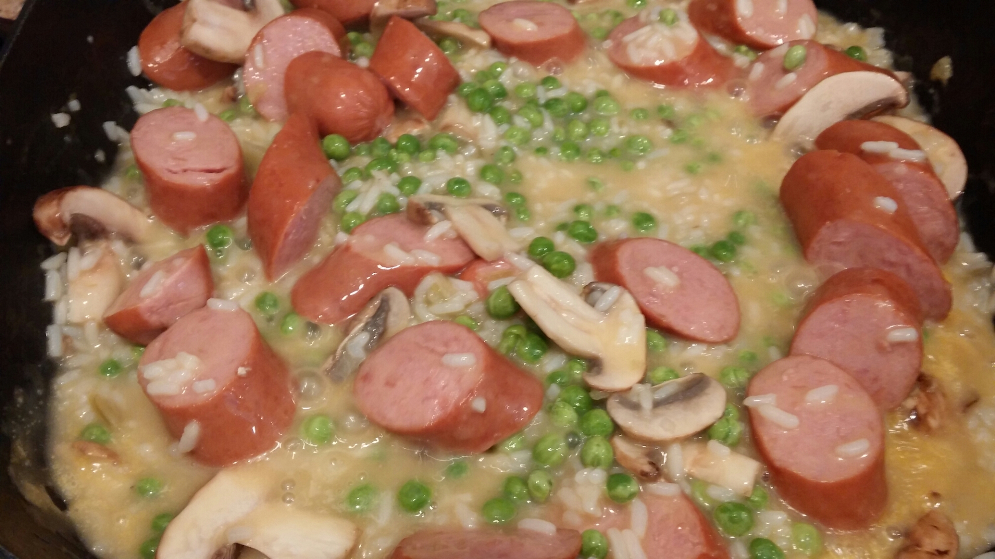 - Stir in peas and mushrooms. Cover and simmer for 15 minutes or until rice is tender and peas are heated through. Sprinkle with cheese; cover and let stand until melted. Yield: 4-6 servings.