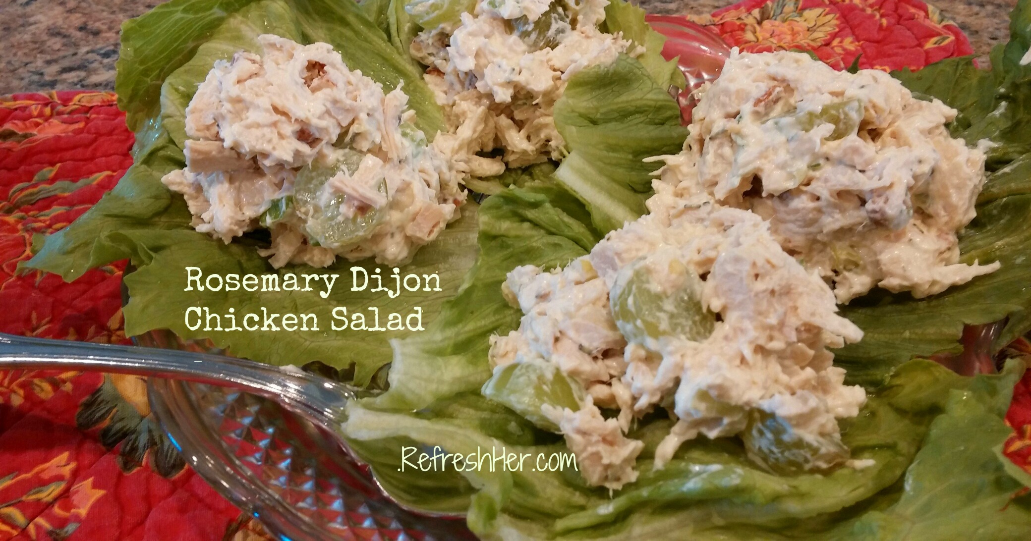 I recently had some ladies over and I really enjoyed trying a new version of a southern favorite –  Chicken Salad.  There are lots of different ways to make it, and I like changing it up a bit.  This recipe calls for Rosemary and Dijon in the dressing.  Also, instead of the normal addition of pecans, you add almonds.  It was very good!  Here’s  a picture of the plated lunch: