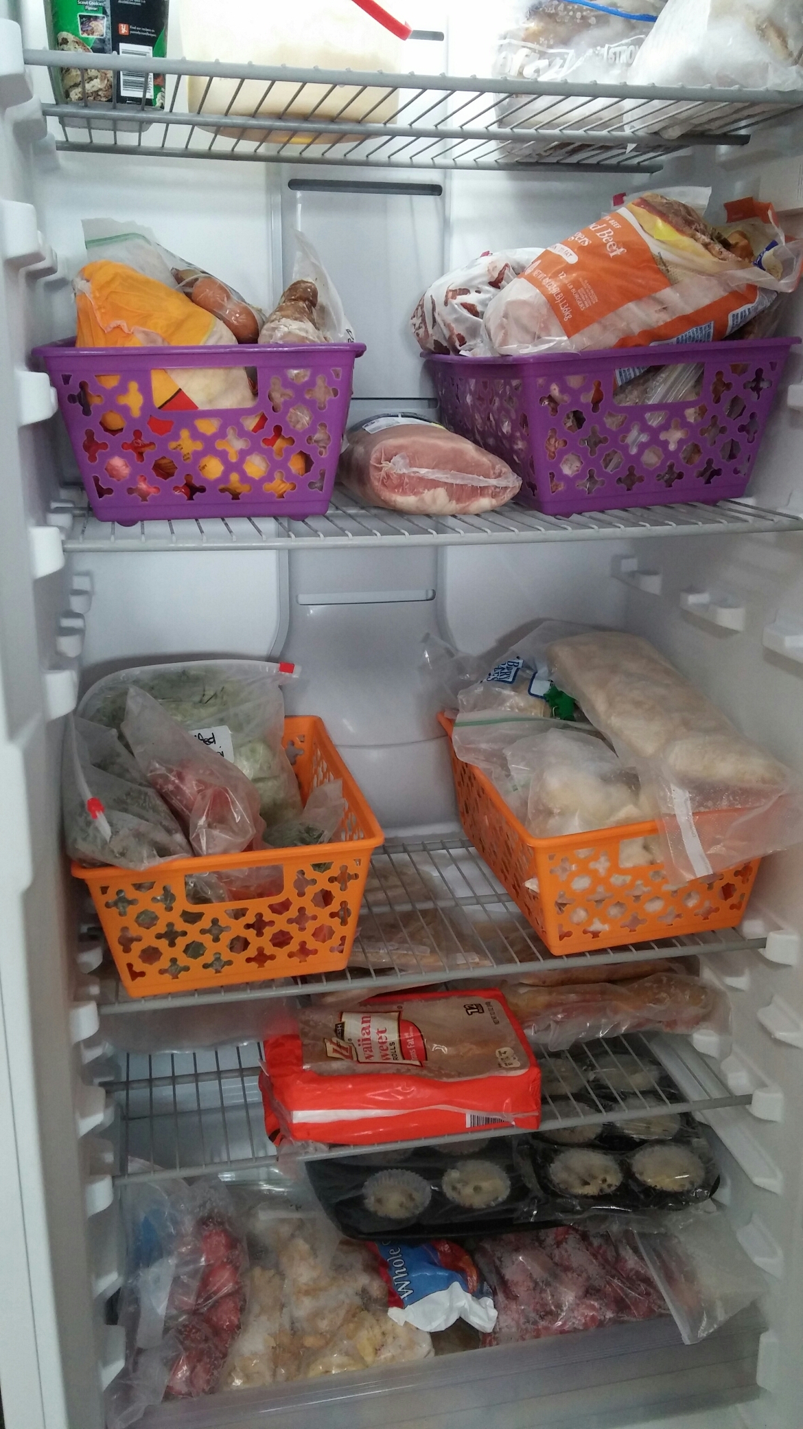 When I got them home, I filled one with beef, one with poultry and pork (Purple baskets). The other two have my frozen vegetables in one and frozen baked goods like my Make-Ahead Butterhorns in the other. Now when I need something I know exactly where to go to find it!