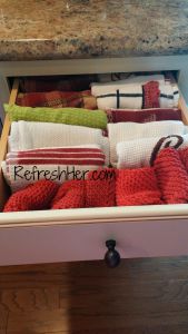 I have one drawer in my kitchen that is designated for kitchen linens – towels and dish cloths. However, the drawer I reserved for those linens isn’t very deep and when I folded them as I was accustomed to doing, I had trouble making room for them all without the drawer getting jammed! Do you ever deal with that? The towels wad up and then the drawer won’t open and you have to fish your hand up in there to retrieve the fabric that got hung. Grrr. I know I could have saved one of the deep drawers for that, but there are certain kitchen utensils that will only fit in those deep spaces.