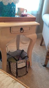 - The book bag under the side table holds my pens, highlighter and Sunday materials. It’s ready to grab and head out the door!