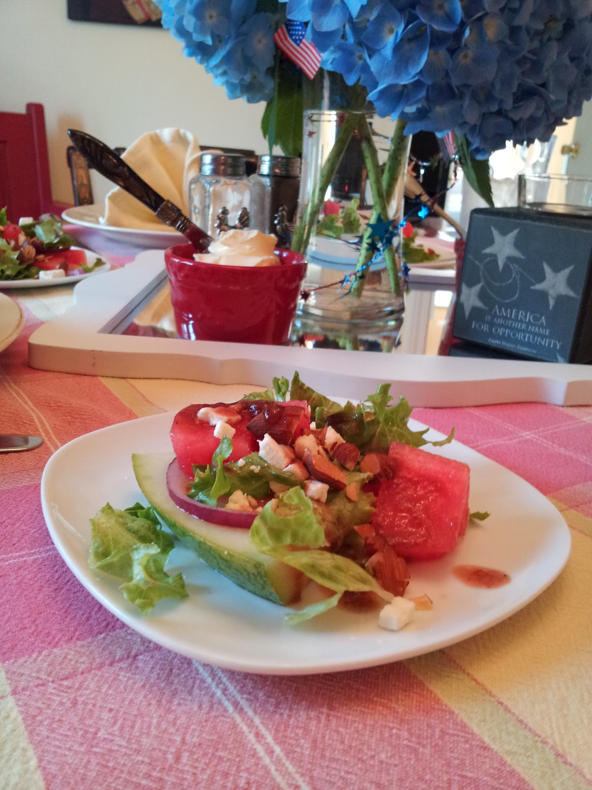 I’ve been making a fruited green salad for several years from Cooking Light, but in my Taste of Home magazine, I found basically the same recipe, only substituting the blueberries or pears with Watermelon! I was excited to try this. I love the presentation; it’s served on a wedge of watermelon.