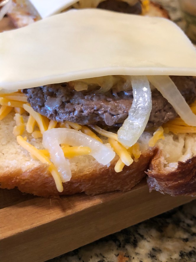 Place the sauce on one side of the bread. On the other side layer the cheddar cheese, cooked Beef patty,  sautéed onions and Swiss cheese. Top with The other piece of bread.
