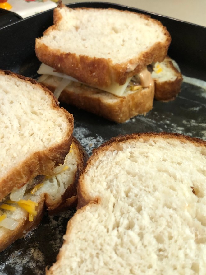 In the recent Southern living magazine, my mom found the recipe for this Patty Melt beauty. The ingredients include beef, sautéed onions, two kinds of cheese, and a delicious homemade sauce for the sourdough bread. Last week I was visiting in my parents home, and she had this on her menu, so I got to make up this recipe that she had marked in her magazine. We all enjoyed it and we each only ate half of a sandwich!
